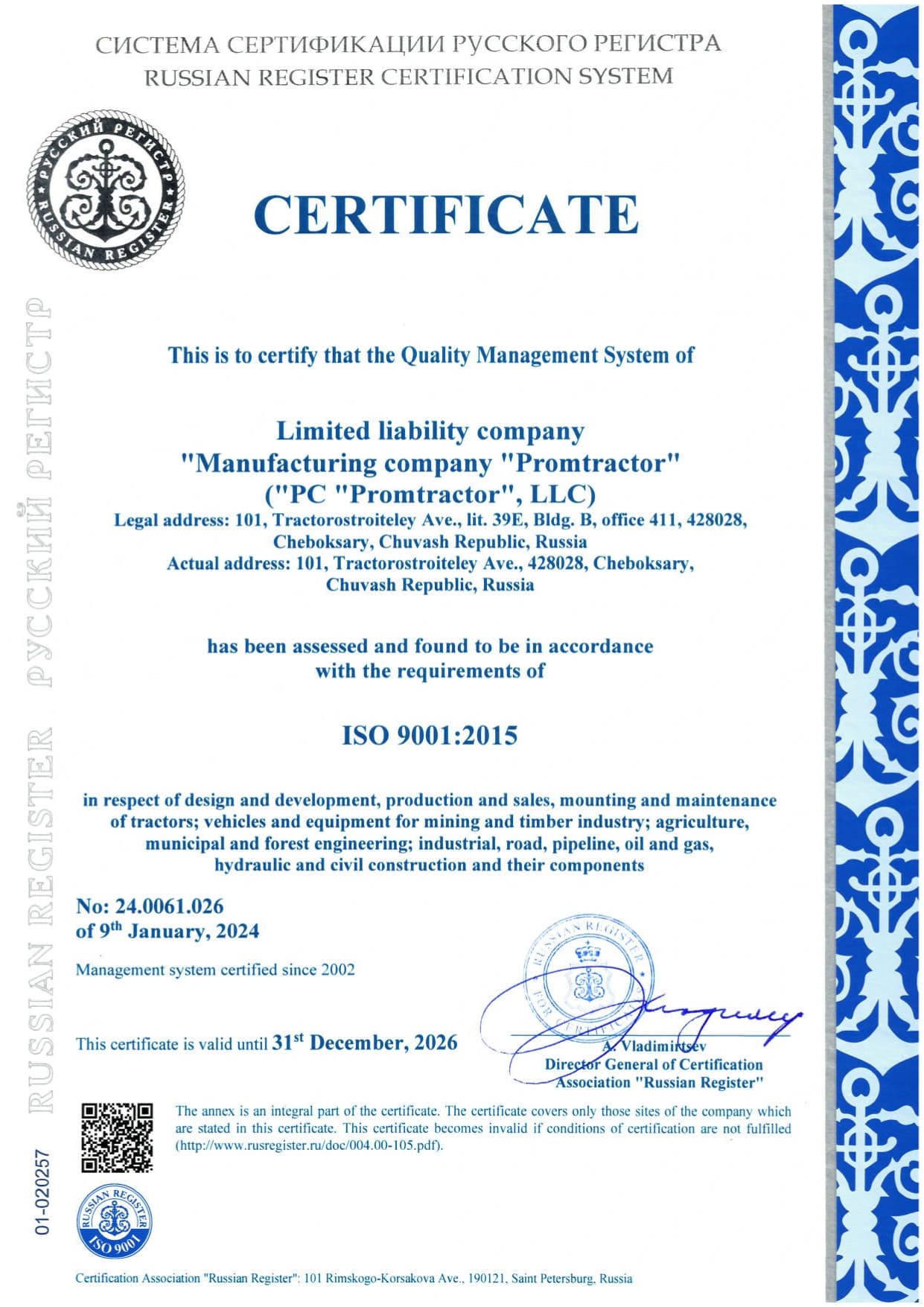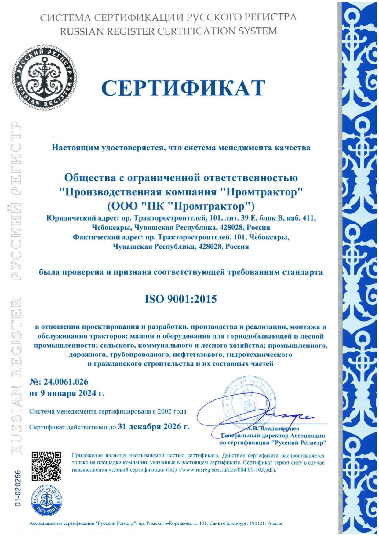 ООО «СЕРВИС-ЧЕТРА» обязуется соблюдать международные стандарты серии ISO 9000 и российские стандарты системы ГОСТ Р в области менеджмента качества. Руководство берет на себя ответственность за реализацию данной политики качества, опираясь на сознательное участие каждого члена коллектива в достижении поставленных целей.
